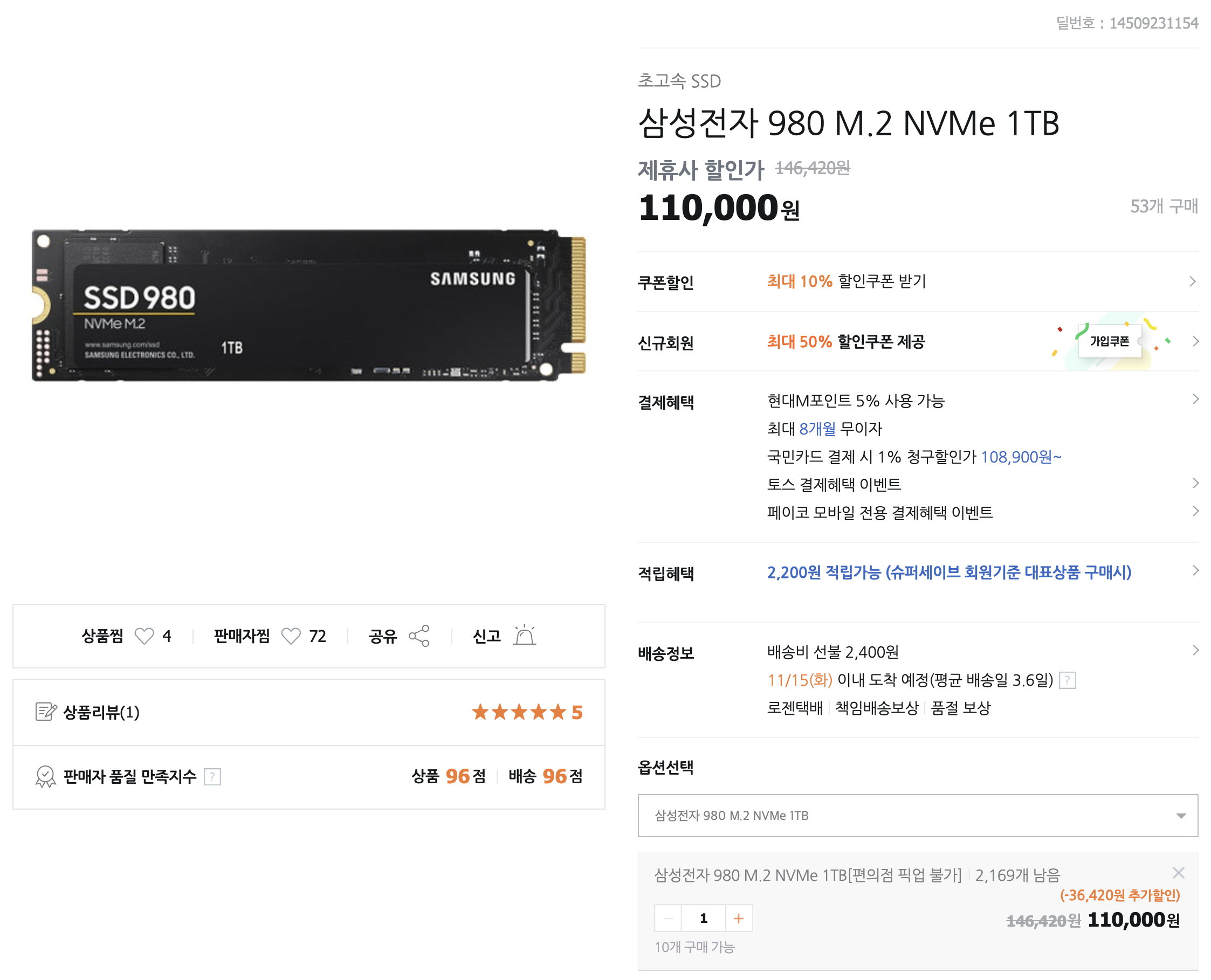 결국 최종 결론은 삼성전자 980M.2 NVMe 1TB입니다. 그런데 쿠팡은 취소했습니다. 다나와 검색으로 티몬으로 들어가니 배송비 포함해서 112,400원에 구입할 수 있었습니다.