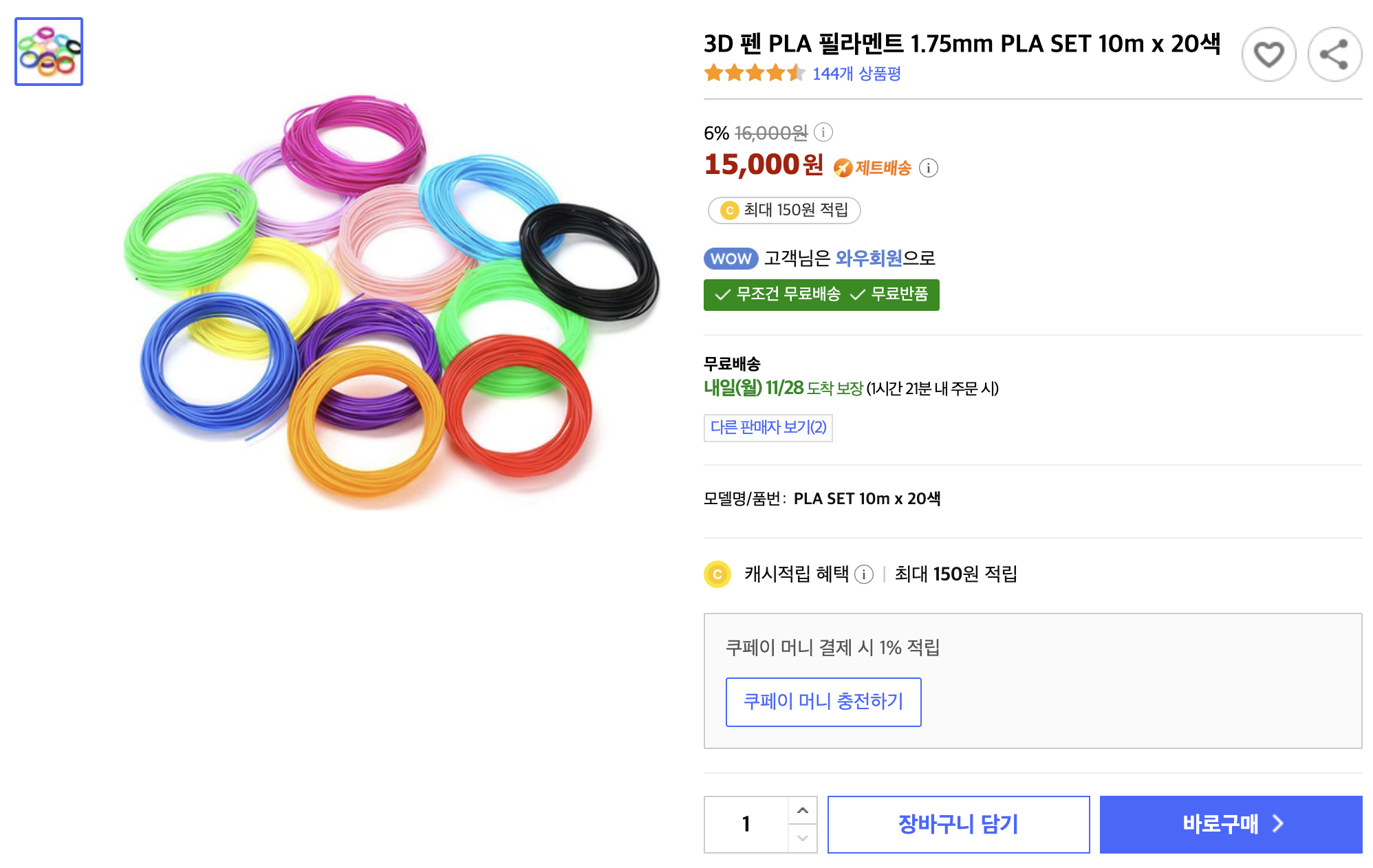 2020년 PLA 필라멘트 12개짜리 2세트 구입했던 것을 이제야 다 썼네요. 아이들이 예전에는 조금씩 만들더니 요즘은 과감하게 만들면서 필라멘트 사용량이 부쩍 늘었네요. 구입 기록과 3D펜 관련 정보를 남겨봅니다.