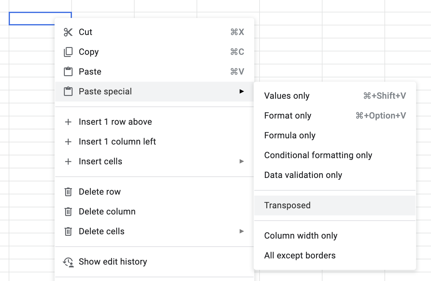 붙여 넣고 싶은 곳에 마우스 우 클릭 하고 "Paste special" -> "Transposed"를 선택합니다.