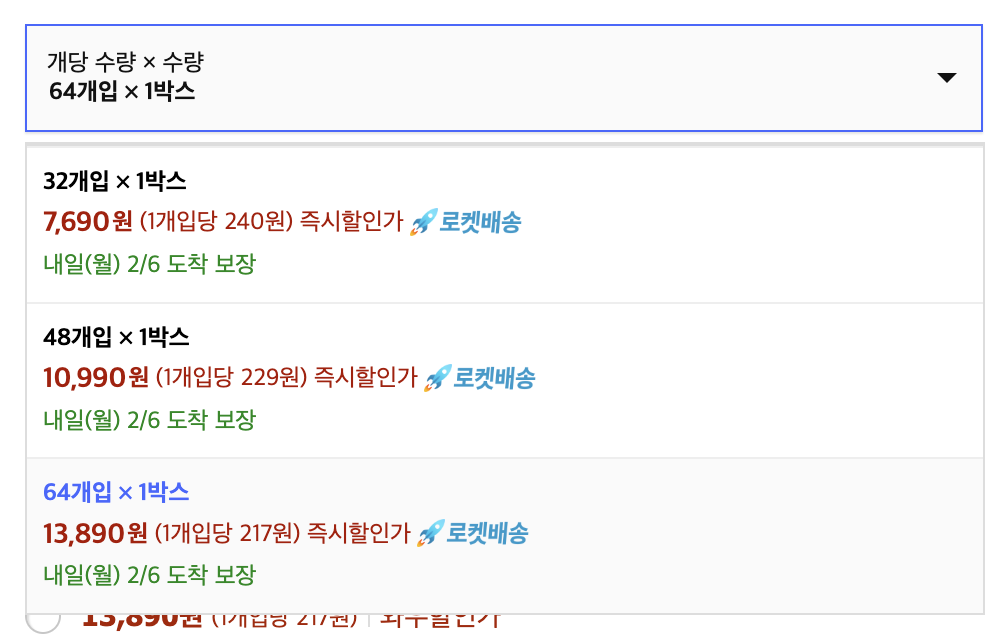 쿠팡 와우할인가 기준 1개당 가격이 240원으로 가장 저렴해 보입니다. 64개 박스로 구입하면 개당 가격이 217원까지 떨어집니다.