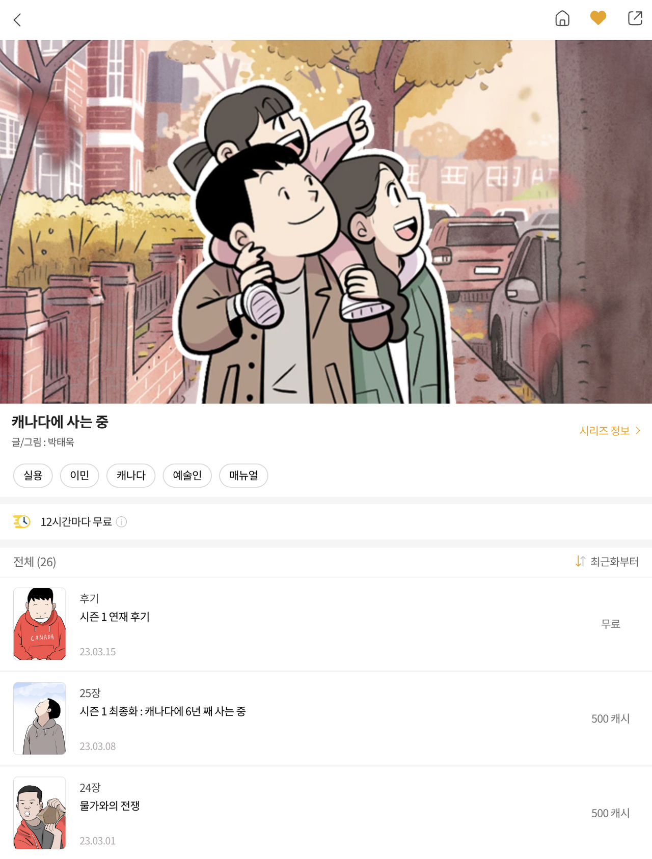 지난번 "우리 집은 캐나다로 정했어요"를 다 읽고 같은 작가가 이만배(이걸 만화로 배워?)에서 연재하는 "캐나다에 사는 중"을 읽었습니다.