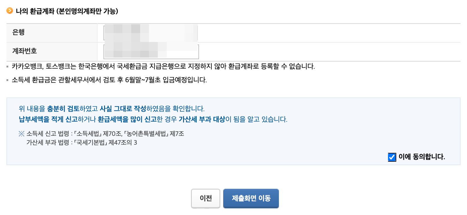 지방소득세는 종합소득세의 10%라서 1,980원을 환급받네요. 계좌정보도 자동으로 다 입력되어 있어서 편리합니다.