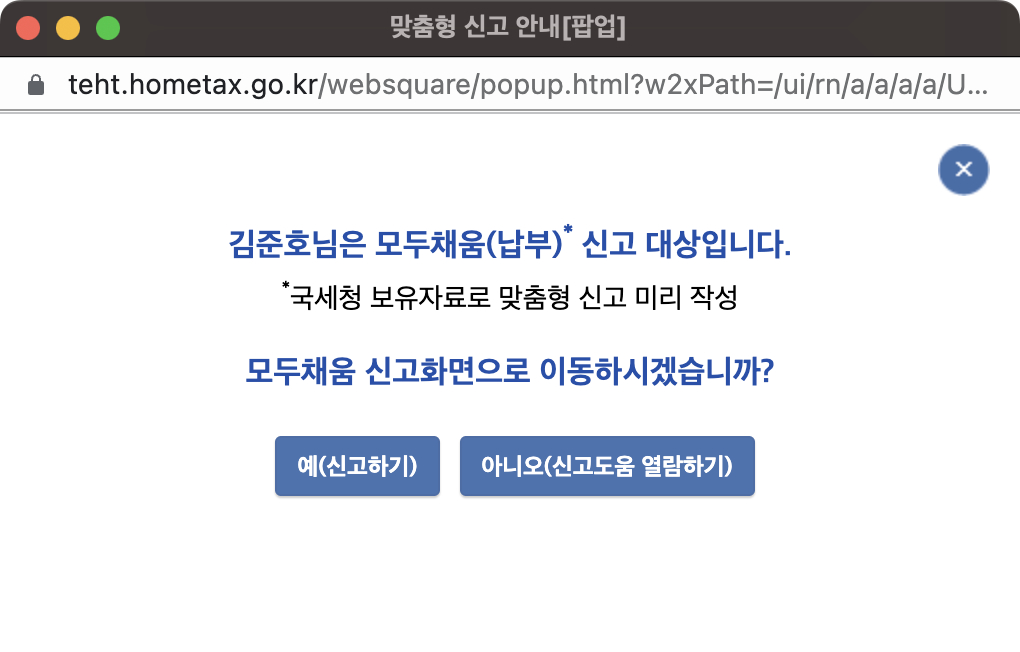 종합소득세 신고 화면으로 들어가면 뭔지는 모르겠지만 "모두채움(납부)" 신고 대상이라고 나오고 "국세청 보유자료로 맞춤형 신고 미리 작성"된다는 팝업이 나타납니다.