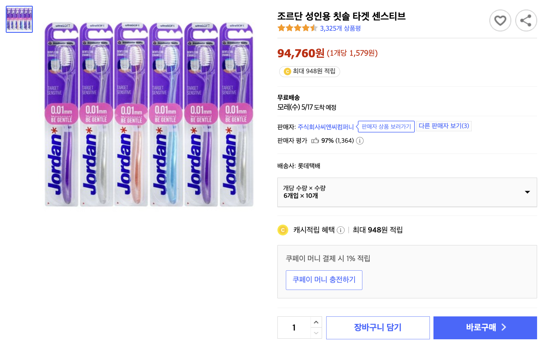 조르단 센스티브 칫솔 주문. 최저가 주문을 위해 60개 주문. 개당 1,579원