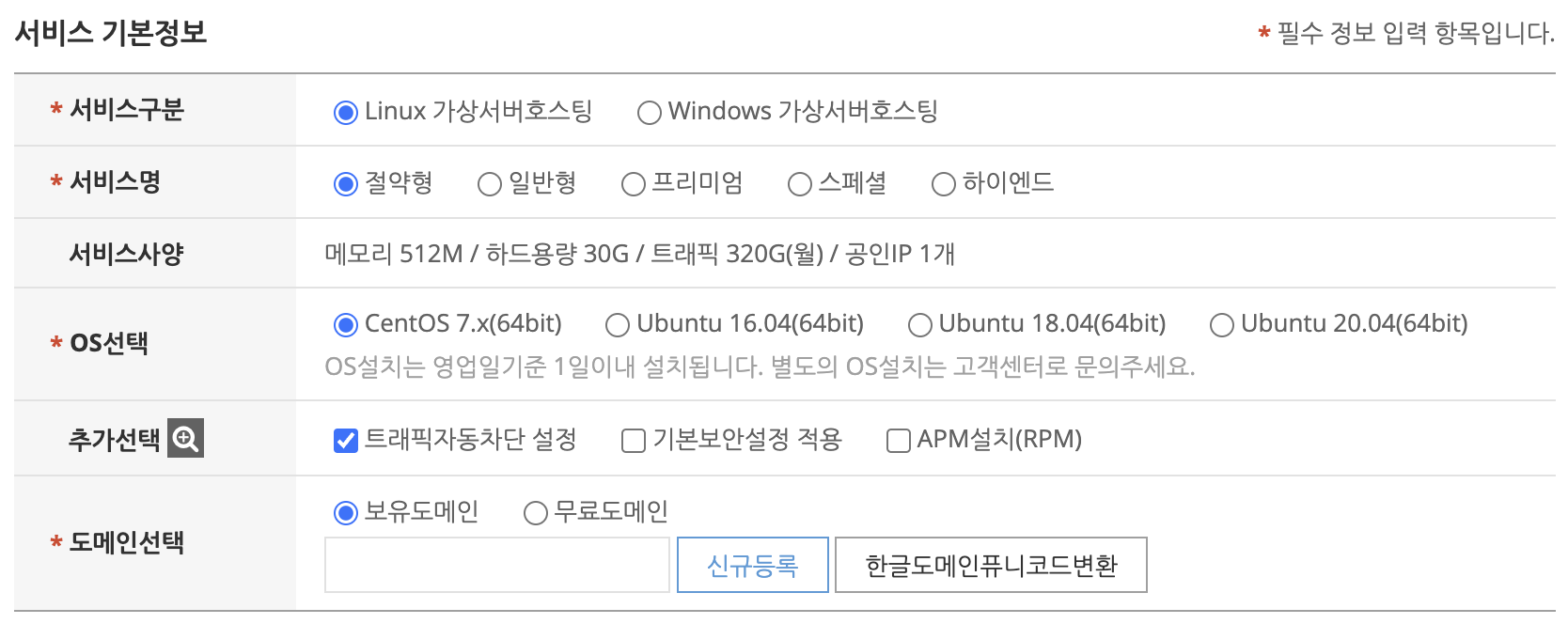 새로 서비스신청 페이지로 들어가면 하드용량 30G에 트래픽 320G로 나옵니다.