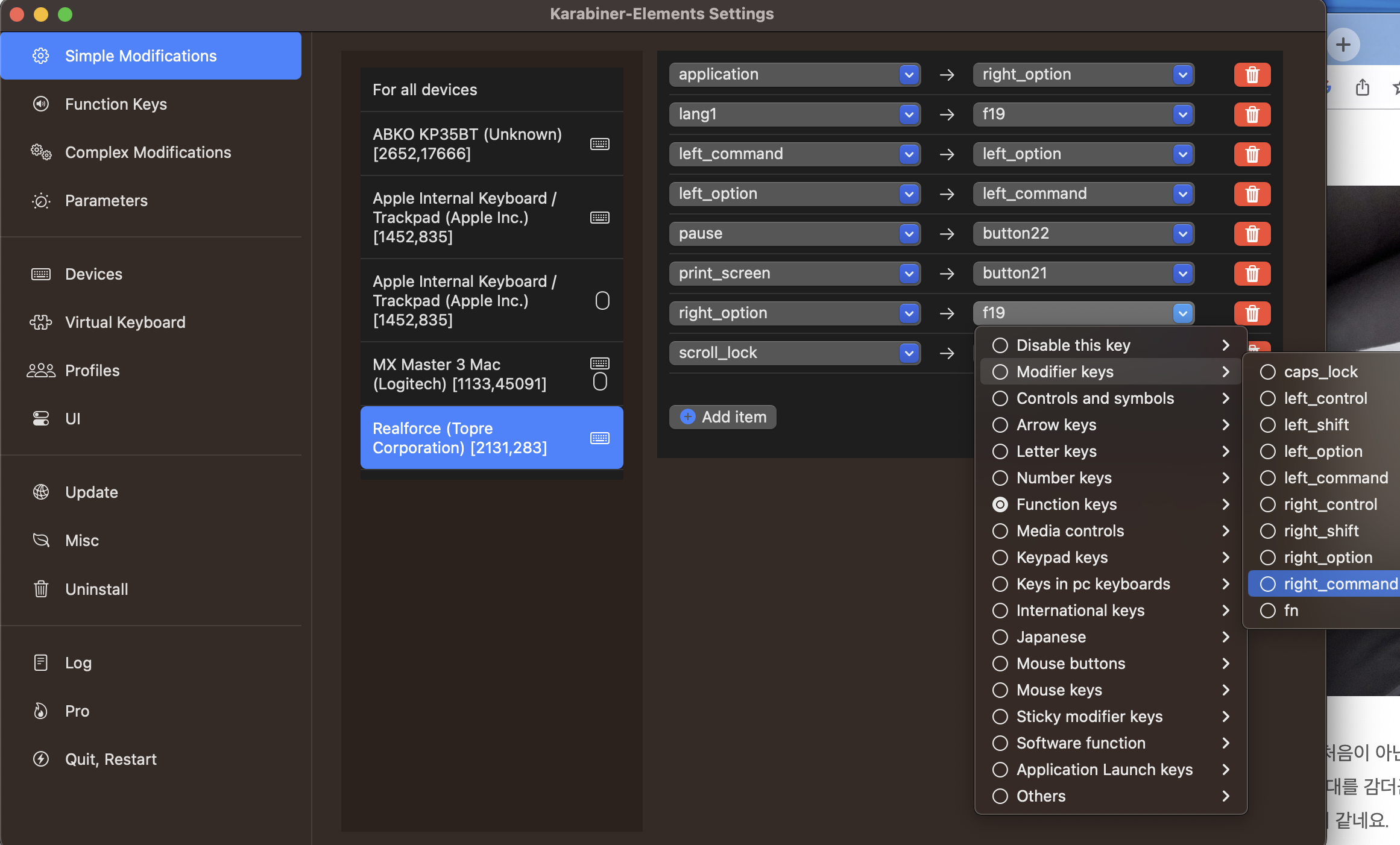 이렇게 설정이 되면 좋겠는데 예전에 Fn 키 같은데 맵핑이 안되었던 거 같기도 한데 긴가민가하네요. 회사에 가면 확인을 해봐야겠습니다. 안되면 또 키보드 기변을 해야 될 거 같네요. 마침 당근마켓에 리얼포스 106 키 키보드가 올라와서 고민되네요. 아직은 시세에 비해 조금 비싼 편이긴 한데 가격이 떨어지면 구입을 생각해 봐야겠습니다.