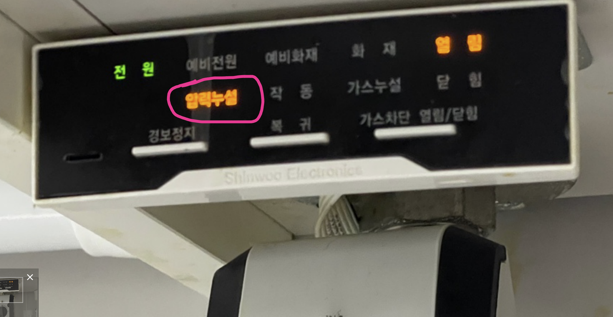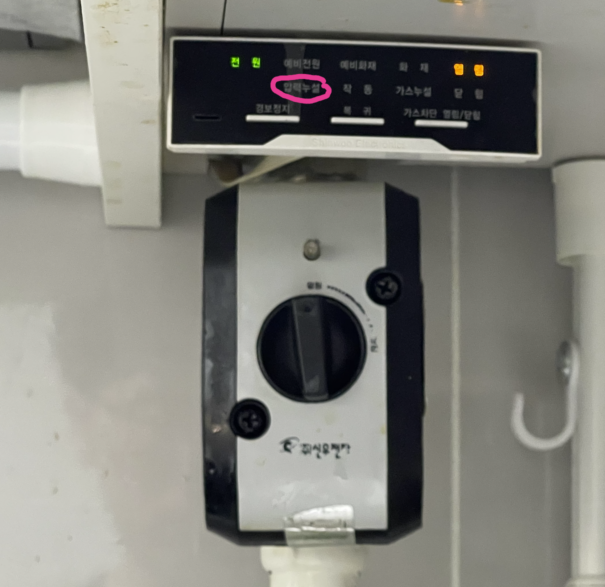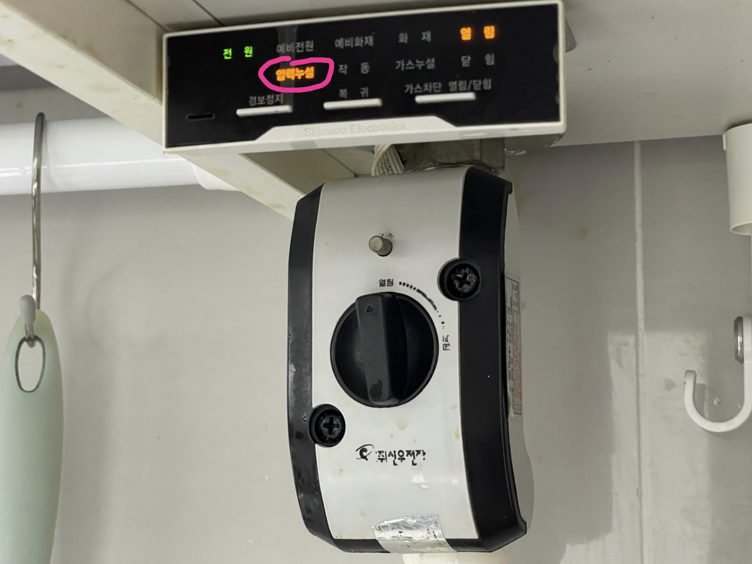 아래쪽에 보이는 "경보정치" 버튼을 누르면 일단 소리가 꺼지긴 하는데 좀 불안합니다. 인터넷에 검색해 보니 "압력누설"은 가스레인지 후드 위쪽에 있는 소화기의 압력문제인 거 같았습니다.