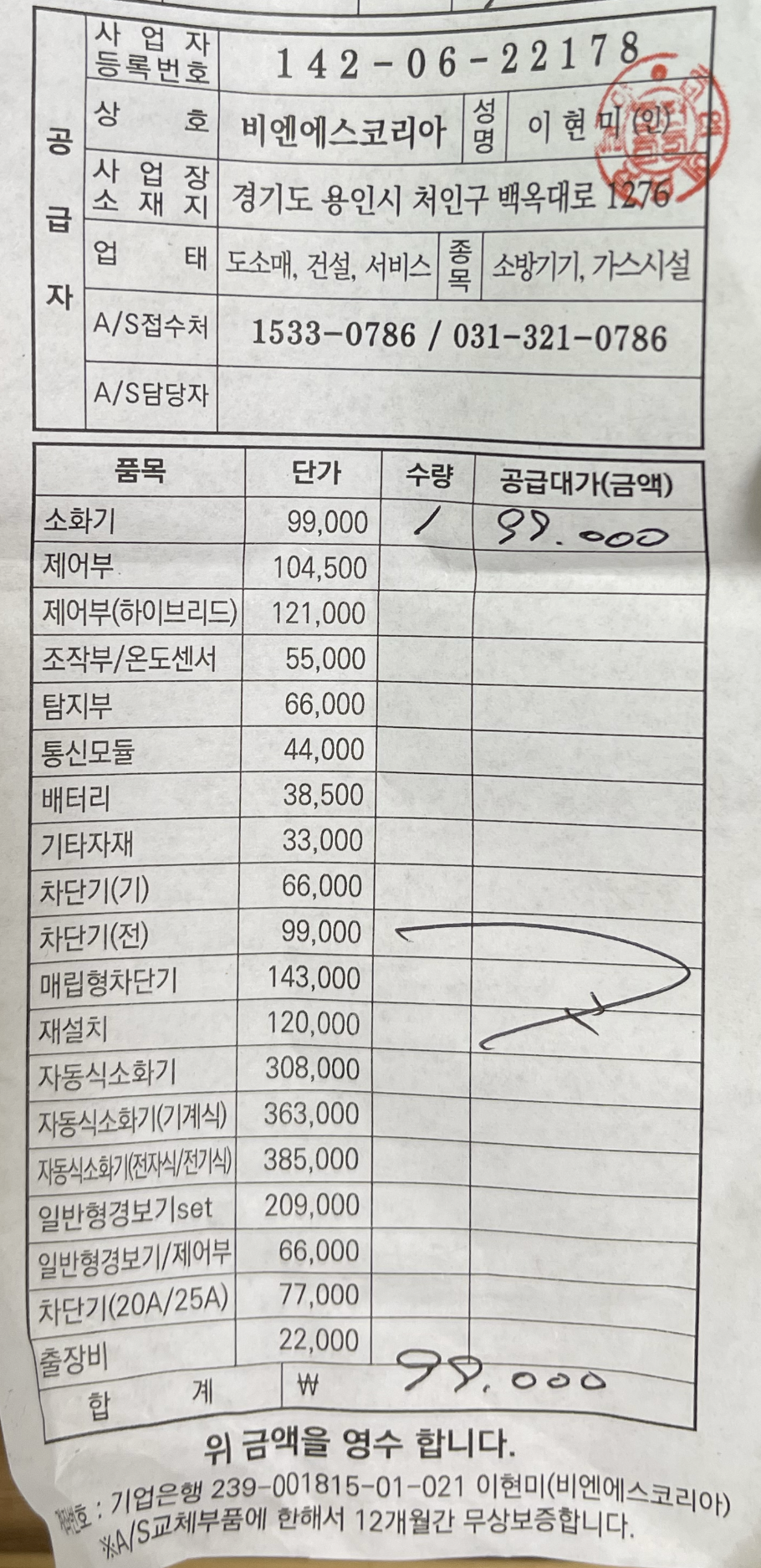 수리비는 99,000원이 나왔습니다. 소화기 비용만 99,000원이네요. 다른 블로그들을 보면 소화기 가격은 5만 원 전 후 정도이고 출장비 등 합하면 비슷한 비용이 나오는 것 같던데요. 여기겠은 정말 소화기가 비싼 것보다는 사실상 출장비 등의 비용이 소화기 가격에 다 포함된 것이 아닌가 싶기도 합니다.