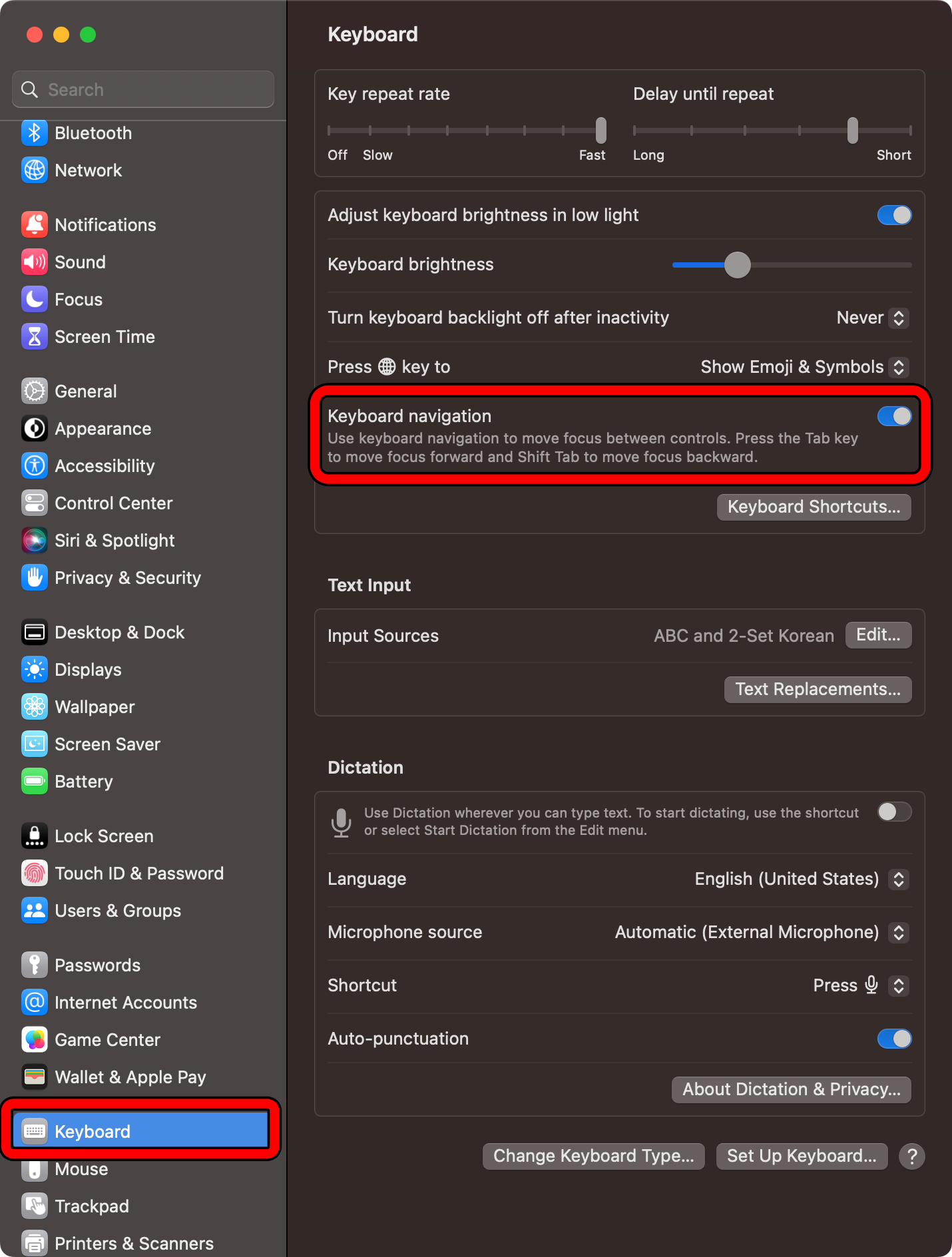 Mac에서 마우스 대신에 키보드를 사용하여 동작을 수행할 수 있습니다.