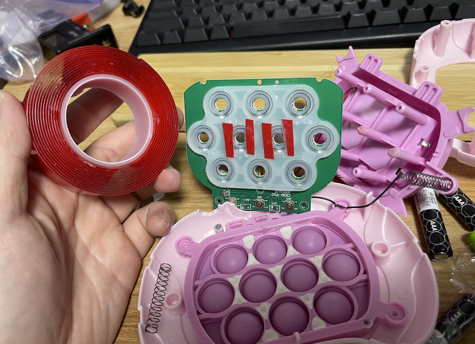 아이들이 가지고 놀더니 버튼 센서 민감도를 높이기 위해 붙여둔 테이프가 떨어졌더군요. 그래서 이번엔 좀 더 접착력이 강할 거 같은 차량용 테이프로 교체했습니다. 좀 더 오래 버틸 수 있길 기대해 봅니다.