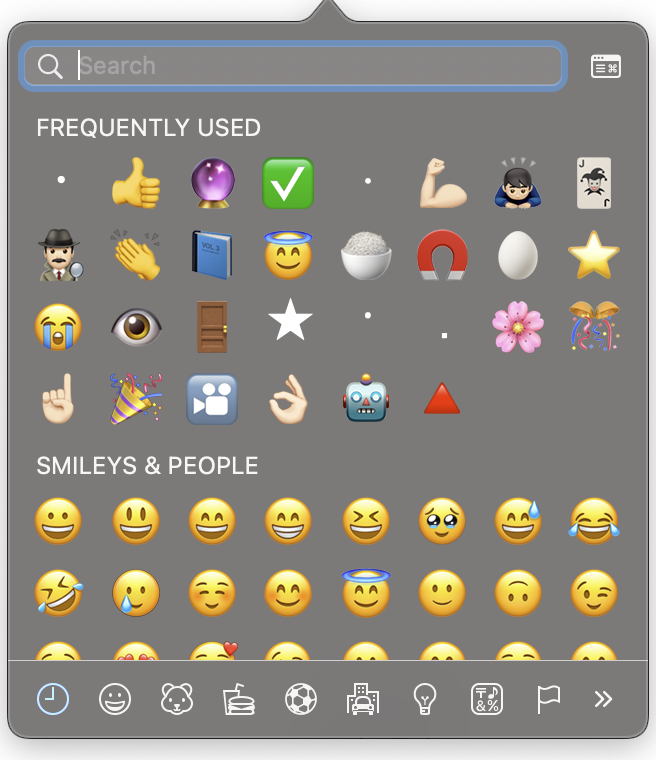 Ctrl + Cmd + Space 키를 입력하면 이모지나 각종 특수문자를 입력할 수 있는 화면이 나타나는데요. 여기서 가운뎃점을 찾아서 사용합니다. 다만 비슷하게 생긴 가운뎃점들 때문에 어떤 가운뎃점이 내가 필요한 가운뎃점인지 확인하기가 쉽지 않습니다.