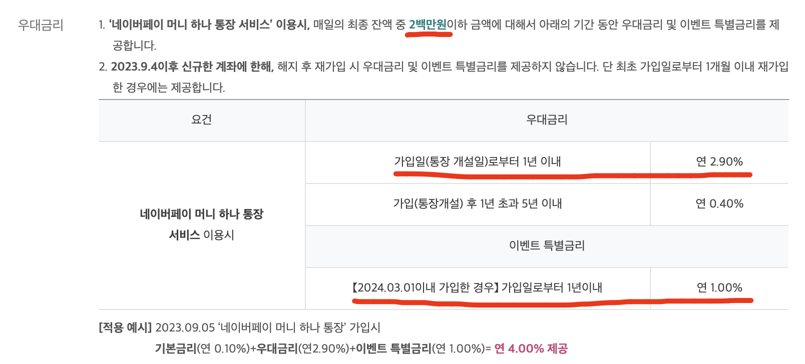한시적이긴 하지만 가입일(통장 개설일)로부터 1년 이내에 연 2.9% 금리와 2024.03.01 이내 가입한 경우 가입일로부터 1년 이내에 이벤트 특별금리 연 1.00% 에 기본금리 연 0.10% 해서 최대 4.0% 금리를 받을 수 있습니다.