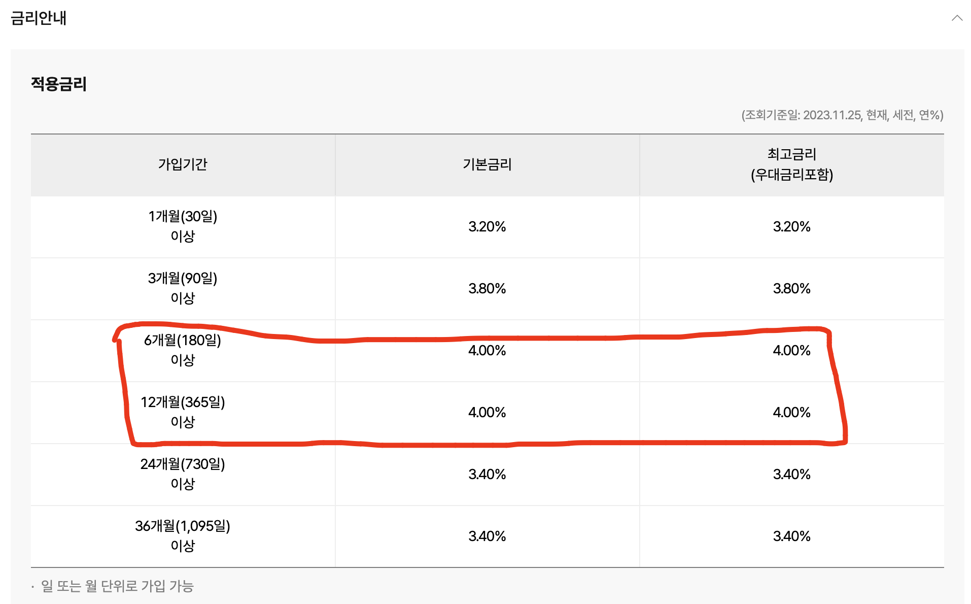 4% 금리를 받기 위해서는 가입기간을 6개월~12개월로 설정해야 합니다. 나머지 기간에는 금리가 줄어들게 됩니다.
