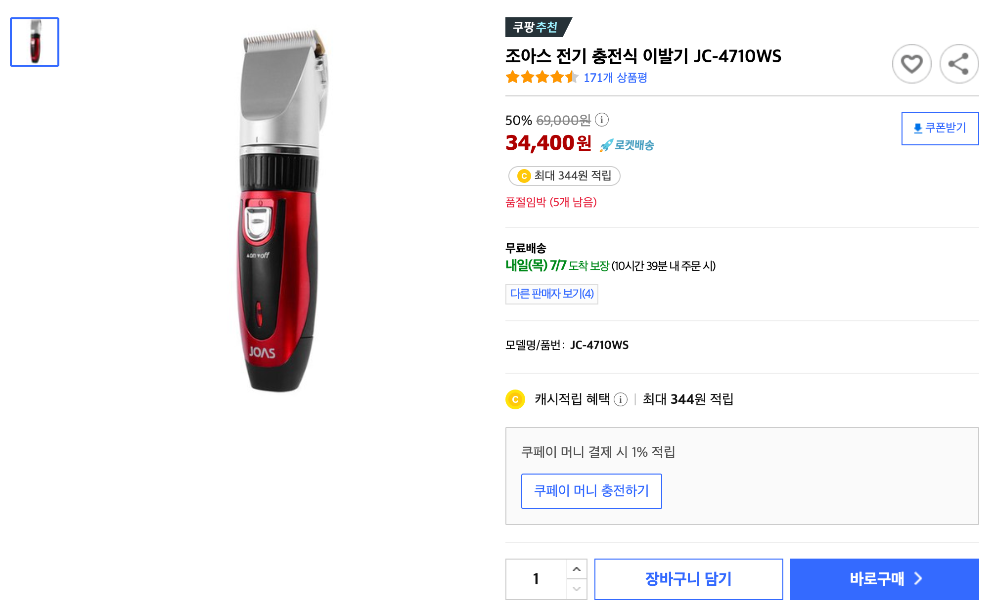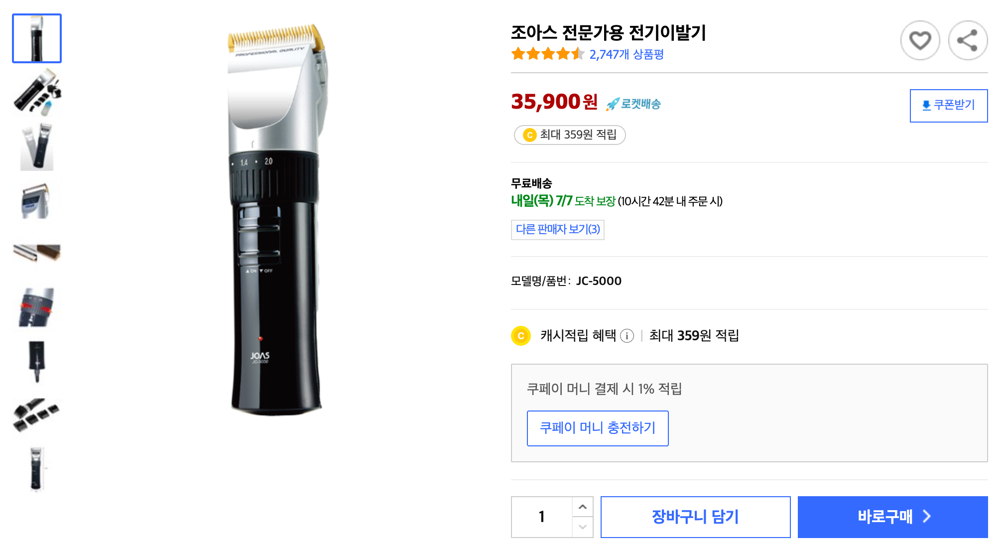 숱가위로만 깎다 보니 비죽비죽 튀어나오는 머리카락 처리가 잘 안 되어서 이발기(일명 바리깡)를 구입해 보기로 하였습니다. 마침 팀원 중 한 명도 직접 머리 깎는 다고 하여 어디 거 쓰냐고 하니 조아스 제품 사용한다고 하여 나도 조아스 제품을 주문해 보았습니다.