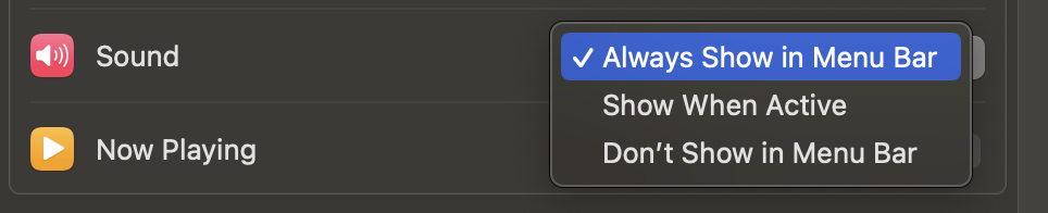 - 사운드 설정 변경: "Control Center Modules"(제어 센터 모듈) 항목에서 "Sound"(사운드) 옵션을 찾습니다. 이를 선택한 후, "Always Show in Menu Bar"(메뉴 바에 항상 표시)를 활성화합니다.