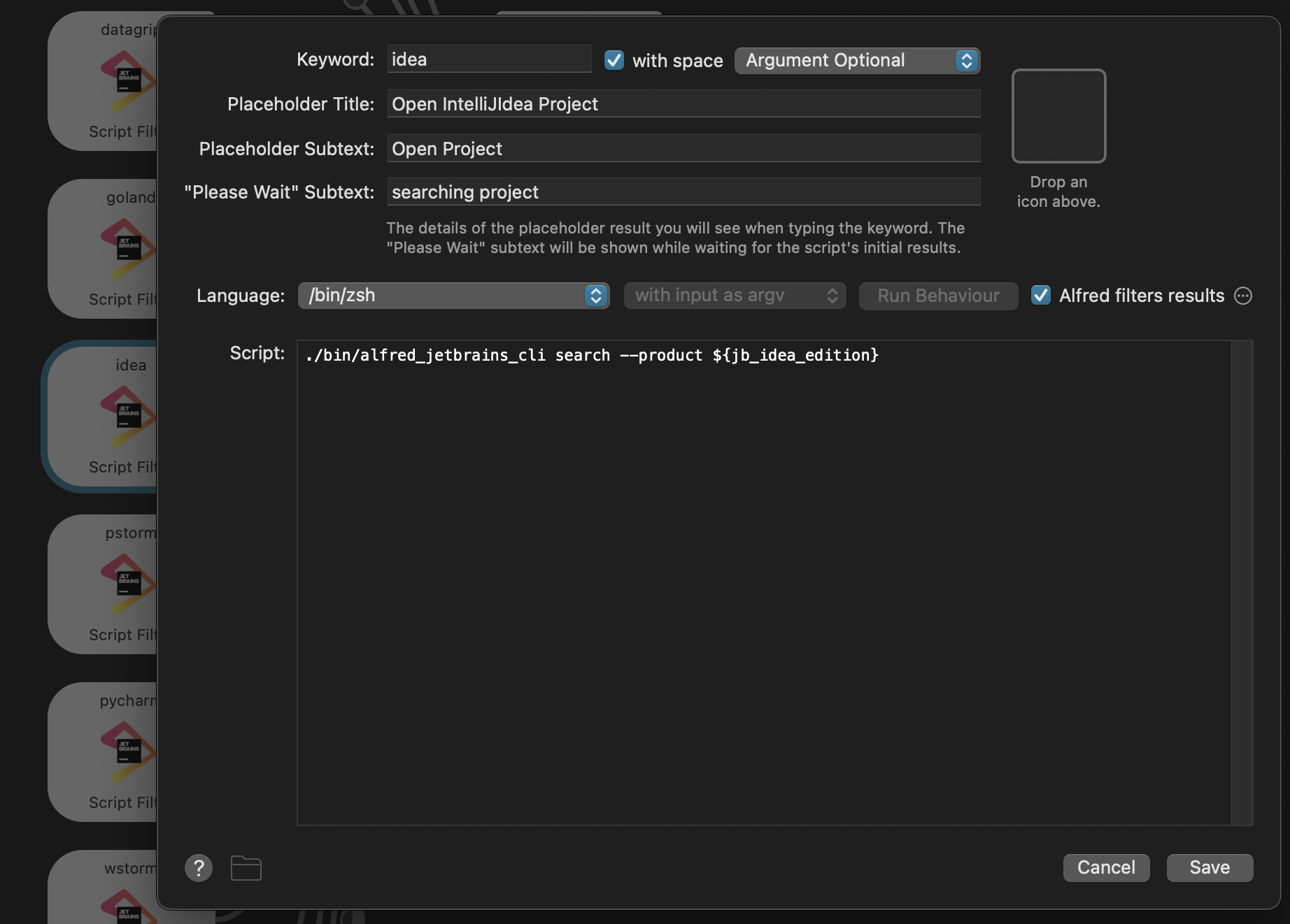 Alfred와 IntelliJ를 사용한다면 다음 워크플로우를 사용하면 JetBrains 툴에서 생성한 프로젝트들을 손쉽게 열 수 있습니다.