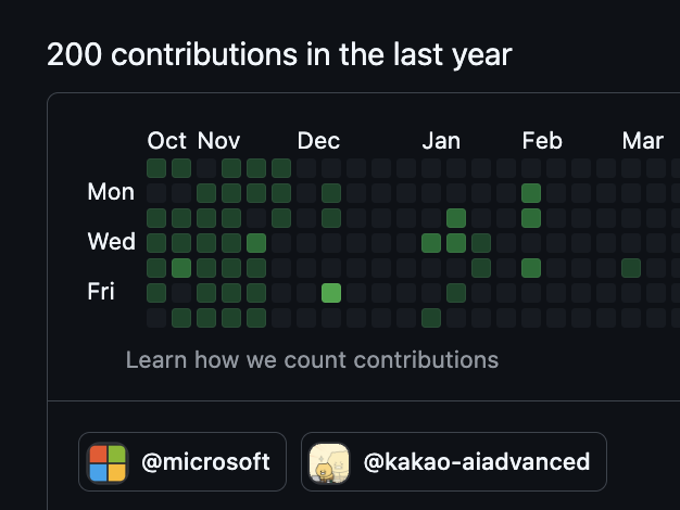 Github 잔디밭에도 microsoft 배지가 나오니 조금 있어 보입니다. 아마 컨트리뷰트 하지 않고 1년이 지나면 사라지지 않을까 싶습니다. 이거도 기념삼에 기록 남겨 봅니다.