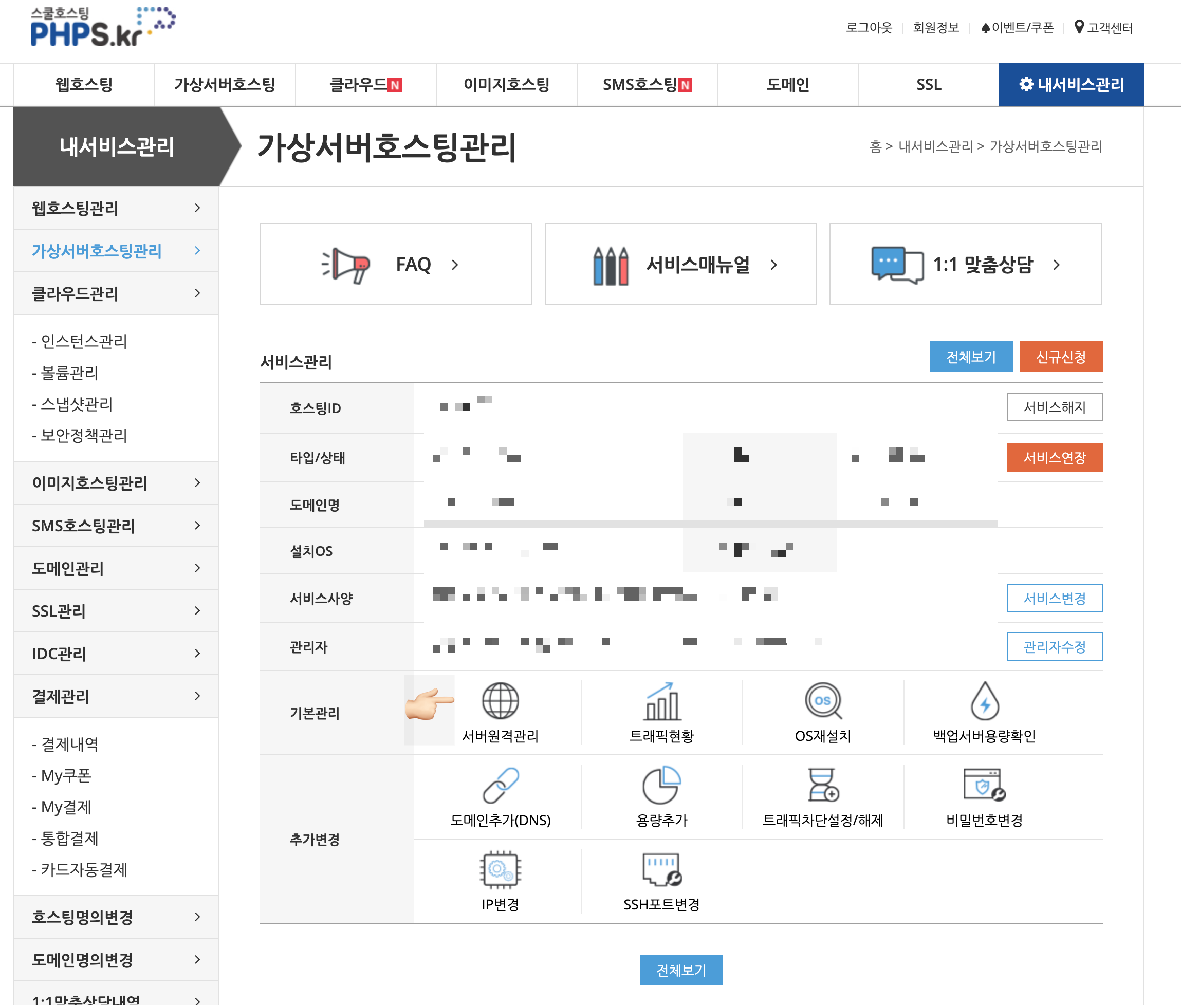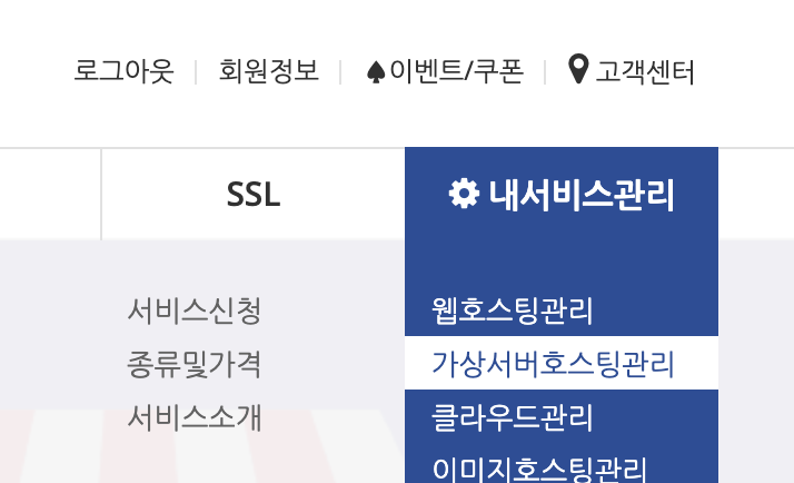 내서비스관리 > 가상서버호스팅관리로 이동합니다.